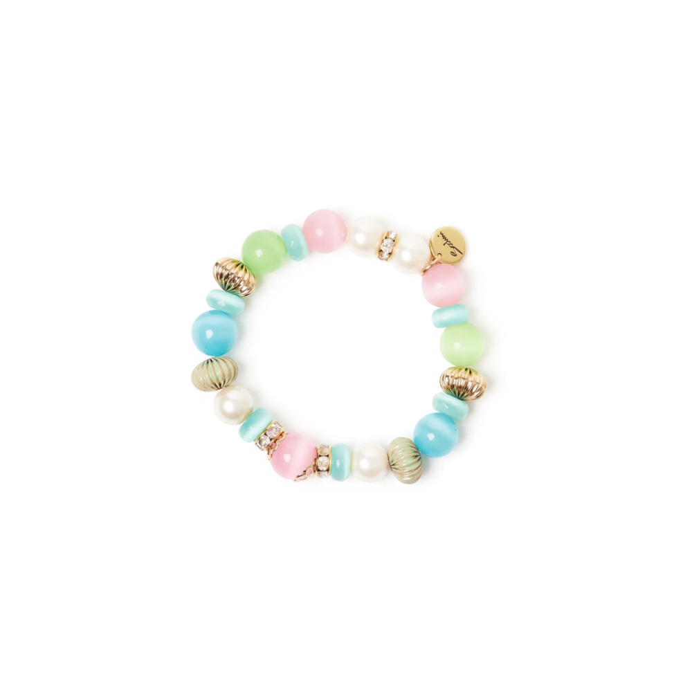 Scopri il piacere di indossare un bracciale elastico di stile sofisticato ma assolutamente brioso. Design accattivante con un filo di luminose sfere, bonbon, perle e anellini di strass, per un unicum che impreziosisce loutfit. Un accessorio perfetto in qualsiasi occasione, nelle sue cromie multicolore e oro. Targhetta Sodini come pendente.