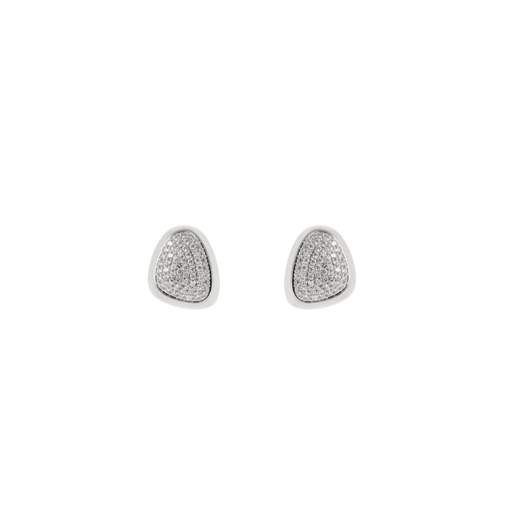 Esclusivi e pregiati questi orecchini aggiungono un tocco moderno su qualsiasi mise. Design radioso con pavè di brillantissimi zirconi in una cornice aurea per un unicum che illumina il viso. Una coppia di accessori perfetti per un look impegnato o per quando vuoi tu, in una versione dalle cromie del rodio finitura matte e bianco trasparente, con logo Sodini sul retro.