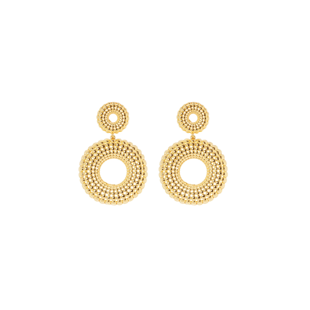 Una coppia di orecchini dalle nuances abbaglianti che ti rendono assolutamente chic. Design splendente con due cerchi dalla superficie a micro sfere che insieme donano splendore al viso. Una coppia di accessori perfetti per un look impegnato o per quando vuoi tu, in una versione dalle cromie dell'oro. Logo Sodini sul retro.