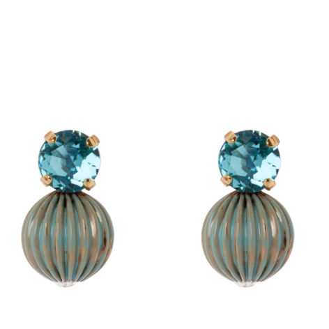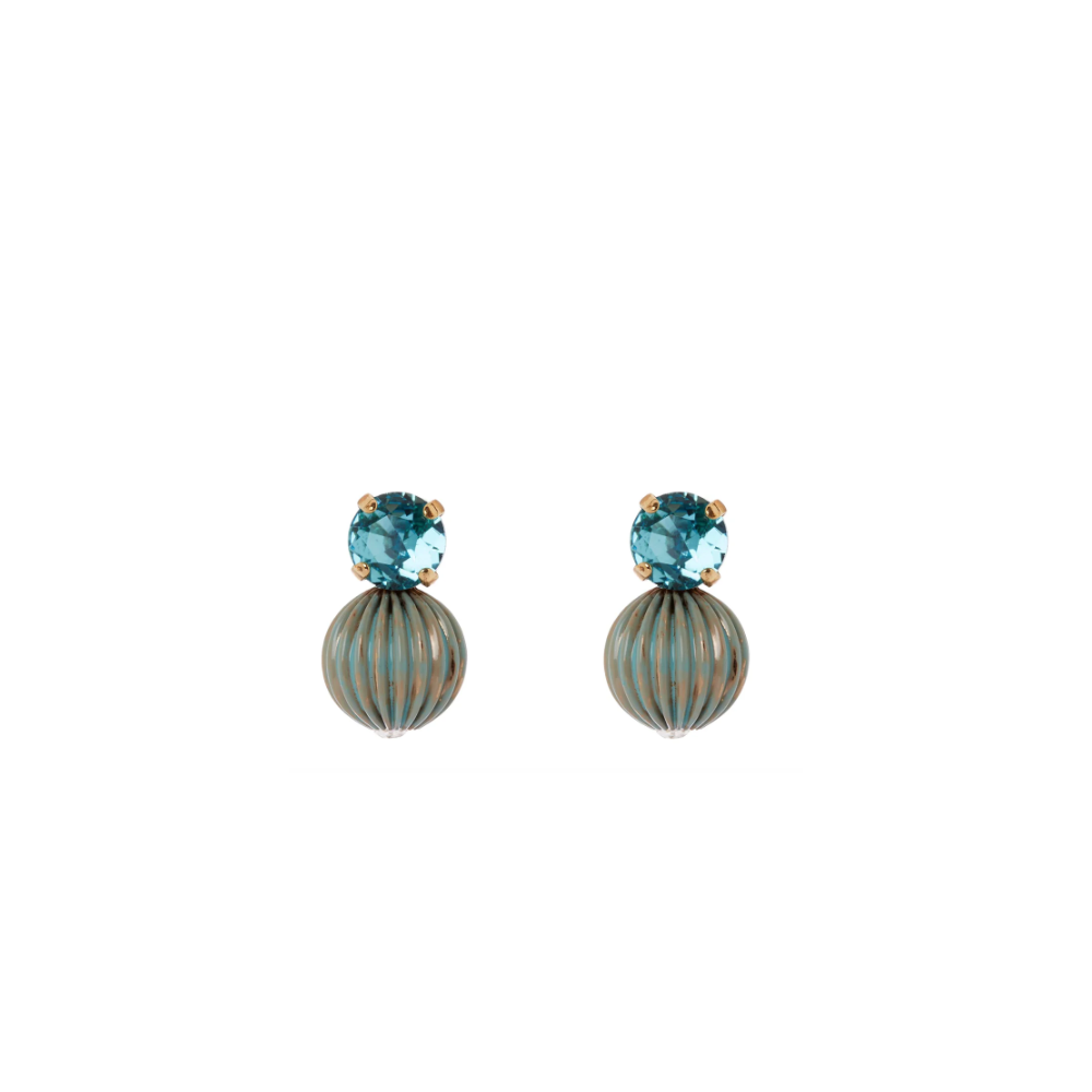 Originali e intriganti questi orecchini aggiungono un tocco moderno su qualsiasi mise. Design con brillante cristallo incastonato congiunto ad una squisita sfera rigata, per un unicum che impreziosisce il viso. Una coppia di accessori perfetti in qualunque occasione, in una versione dalle cromie del celeste e oro, logo Sodini sul retro.