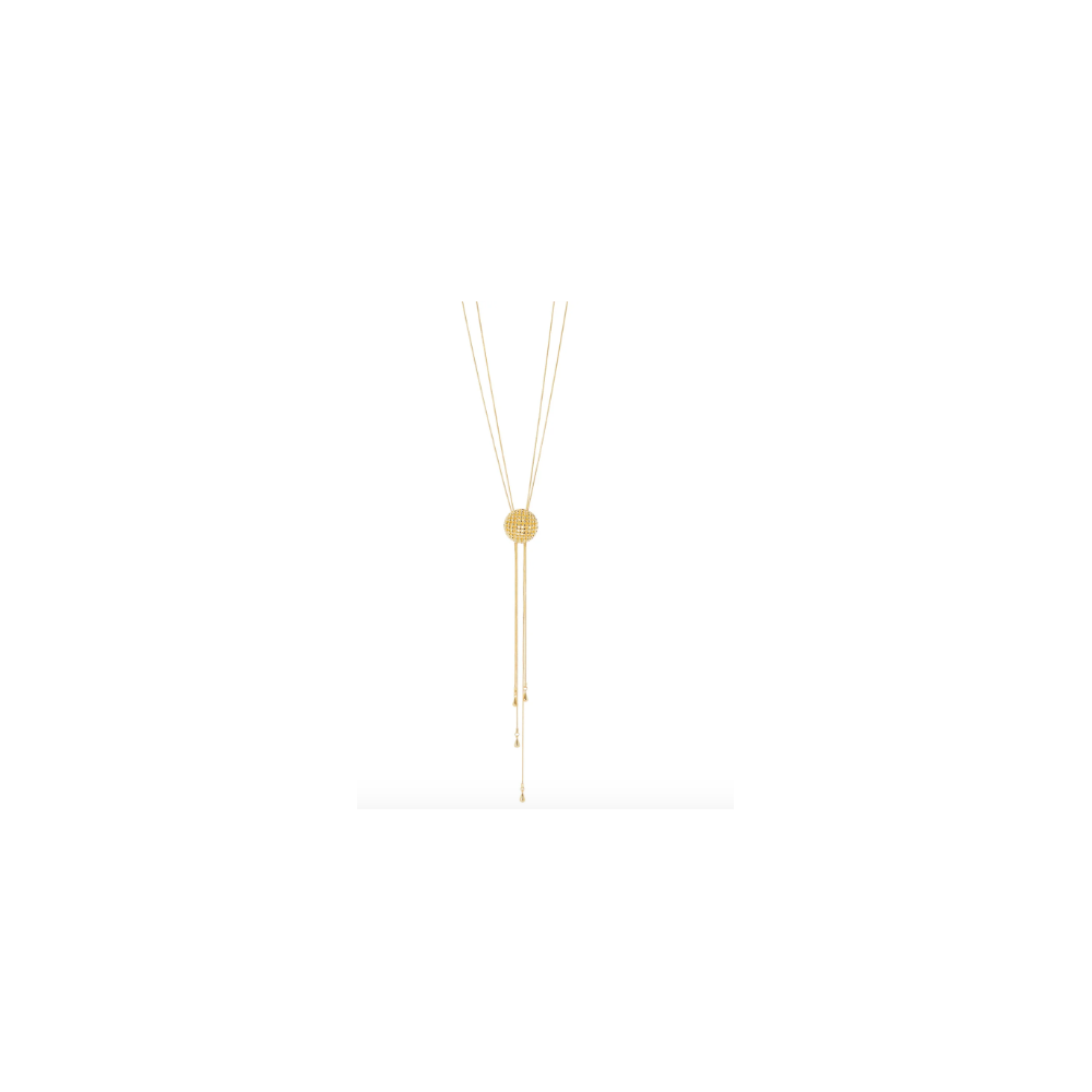 Moderna ma dal fascino millenario questa collana lunga aggiunge un tocco chic su qualsiasi mise. Design a cravatta con quattro splendenti catene a filo che incontrano un charm a microsfere e terminano con mini gocce. Un accessorio perfetto in qualsiasi occasione, in una versione dalle cromie dell'oro. Targhetta Sodini sul retro.
