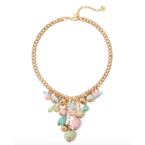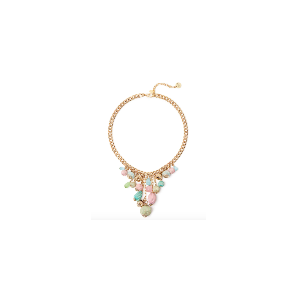 Accattivante e unico questo girocollo aggiunge un tocco prezioso su qualsiasi mise. Design con splendente catena groumette a grandi maglie che al centro sorregge squisiti e intriganti piccoli pendenti che insieme arricchiscono di splendore il look. Un accessorio perfetto in qualunque occasione, nelle sue cromie multicolore e oro. Targhetta Sodini sullestensione.
