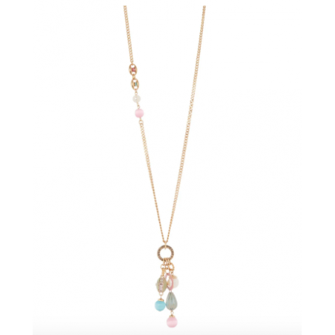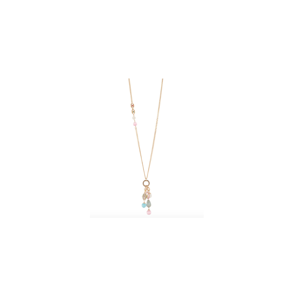 Accattivante e stilosa questa collana lunga aggiunge un tocco prezioso su qualsiasi mise. Design con splendente sottile catena groumette che ospita due maglie marinare e sorregge un intrigante pendente composto da squisiti elementi che insieme arricchiscono di splendore il look. Un accessorio perfetto in qualunque occasione, nelle sue cromie multicolore e oro. Targhetta Sodini sullestensione