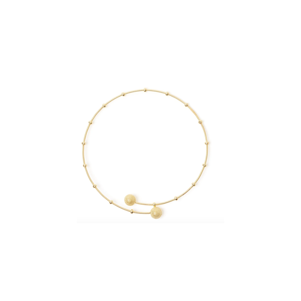 Moderna ma dal fascino retrò questa collana corta aggiunge un tocco esclusivo su qualsiasi mise. Design con radioso filo argenteo che ospita degli spendenti anellini e due luminose boule a microsfere alle estremità, per un unicum di grande effetto. Un accessorio perfetto in qualsiasi occasione, in una versione dalle cromie dell'oro, con logo Sodini.