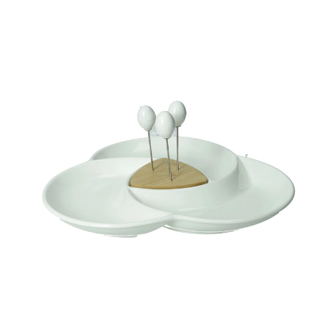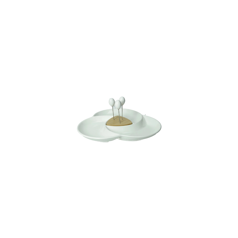Antipastiera in porcellana e bamboo con 3 forchettine in porcellana e inox