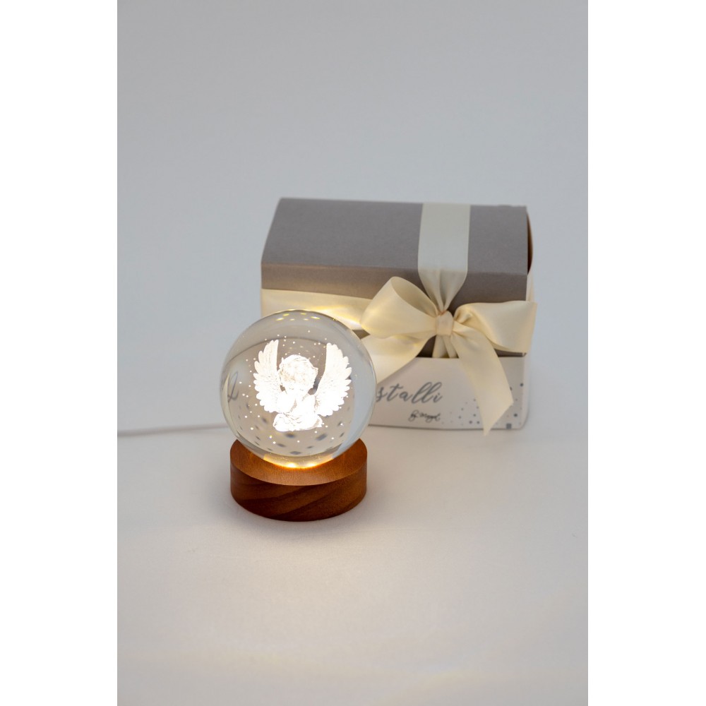 Sfera laser grande con soggetto angelo e base in legno, LED integrato.