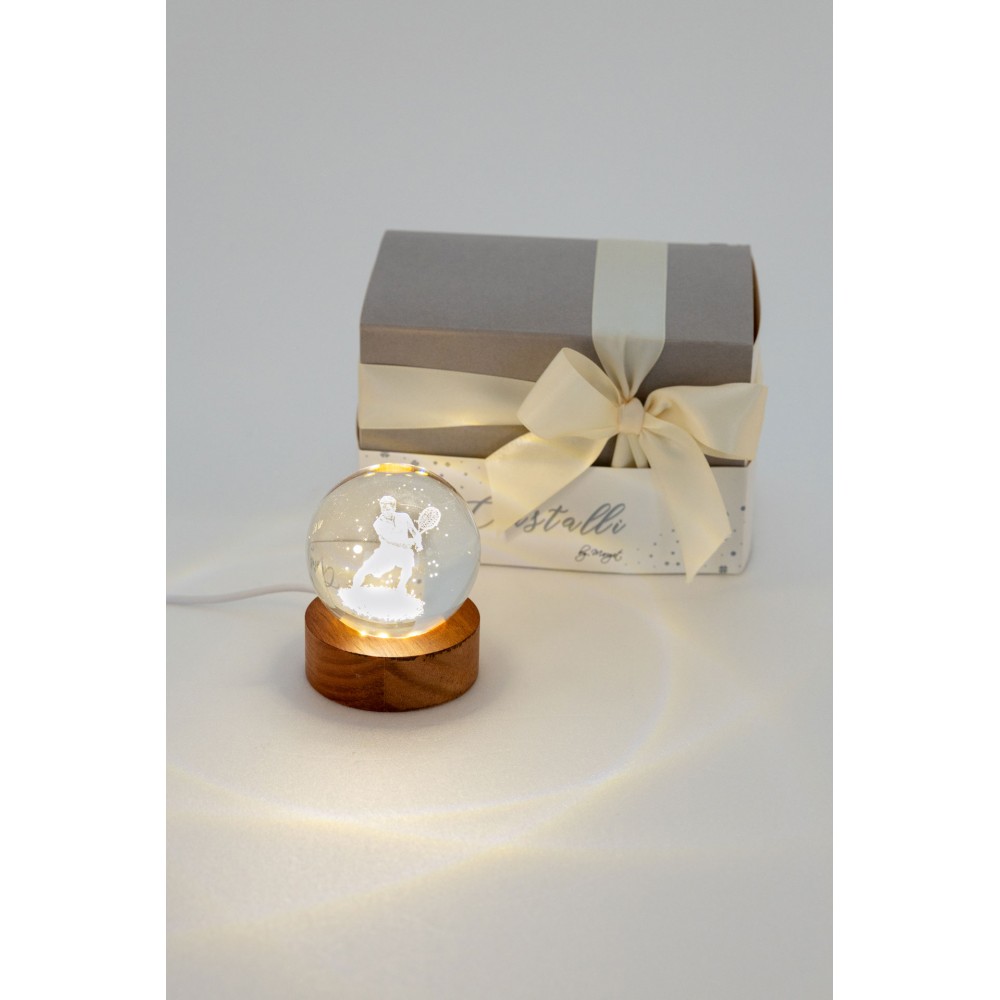 Sfera laser piccola con soggetto tennista e base in legno, LED integrato.