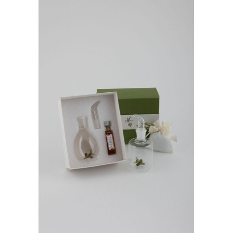 Oliera piccola in vetro, 2 forme assortite. Con scatola e sacchettino. Olio e miele non sono compresi nel prezzo, si acquistano a parte