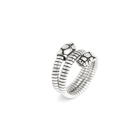 Iconico e avvolgente, questo anello in argento realizzato in maglia tubogas rigida si distingue per il suo doppio giro dal design deciso. Le estremità, rifinite con l’inconfondibile texture croco, aggiungono un accento animalier raffinato, in cui contemporaneità ed eleganza si incontrano con naturale equilibrio. Un gioiello dal carattere forte e distintivo, interamente realizzato a mano in azienda.