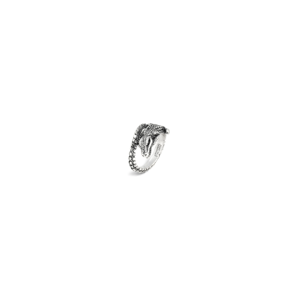 Un anello da mignolo in argento brunito, di dimensioni ridotte, che riflette e interpreta le caratteristiche di design più distintive del brand. Esso riproduce per intero un coccodrillo, dalla testa alla coda, con quest'ultima che va a cingere il dito ottenendo un effetto dinamico e avvolgente. Fatto a mano in azienda.