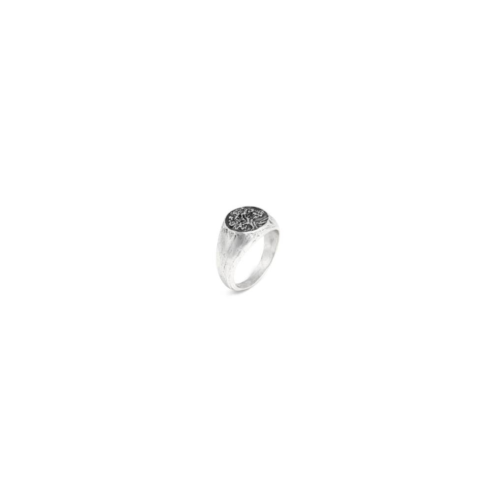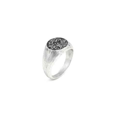 Un delizioso anello da mignolo in argento brunito, di dimensioni ridotte e stile Chevalier, che riflette e interpreta le caratteristiche di design più distintive del brand. Esso raffigura l'albero della vita, simbolo di energia e rinascita. Fatto completamente a mano in azienda.