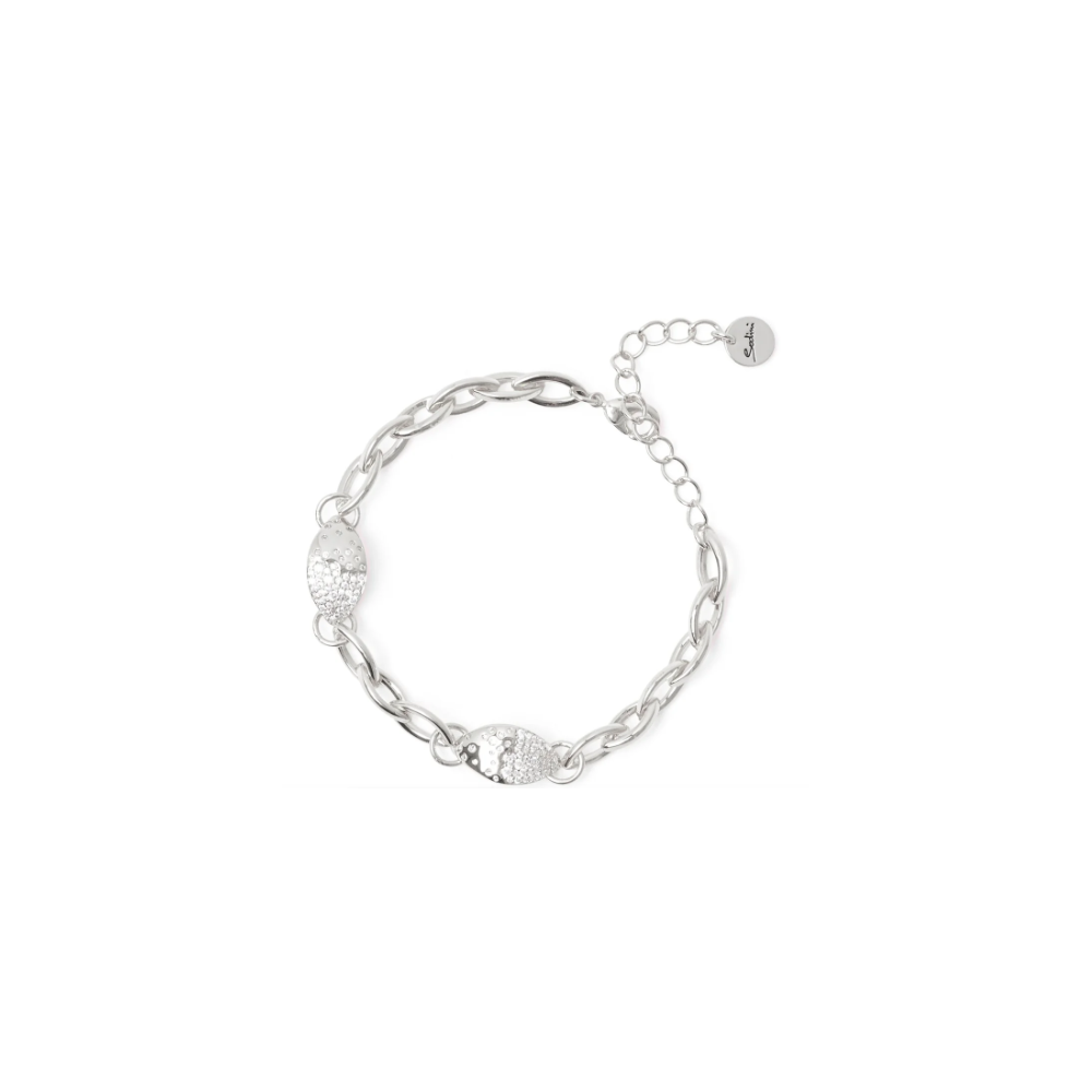 Scopri il fascino di indossare un bracciale dal design luminoso, con splendente catena che incorpora due abbaglianti elementi a forma di mandorla impreziositi da brillantissimi pavè di cristalli. Un accessorio di gran classe con un accento trendy in una versione dalle cromie del rodio, per essere sempre al centro dell'attenzione. Targhetta Sodini sull'estensione.