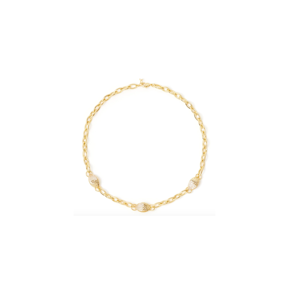 Prezioso girocollo dal design luminoso, con splendente catena che incorpora tre abbaglianti elementi a forma di mandorla impreziositi da brillantissimi pavè di cristalli. Un accessorio di grande glamour con un accento fashion in una versione dalle cromie dell'oro, per essere sempre al centro dell'attenzione. Targhetta Sodini sull'estensione.