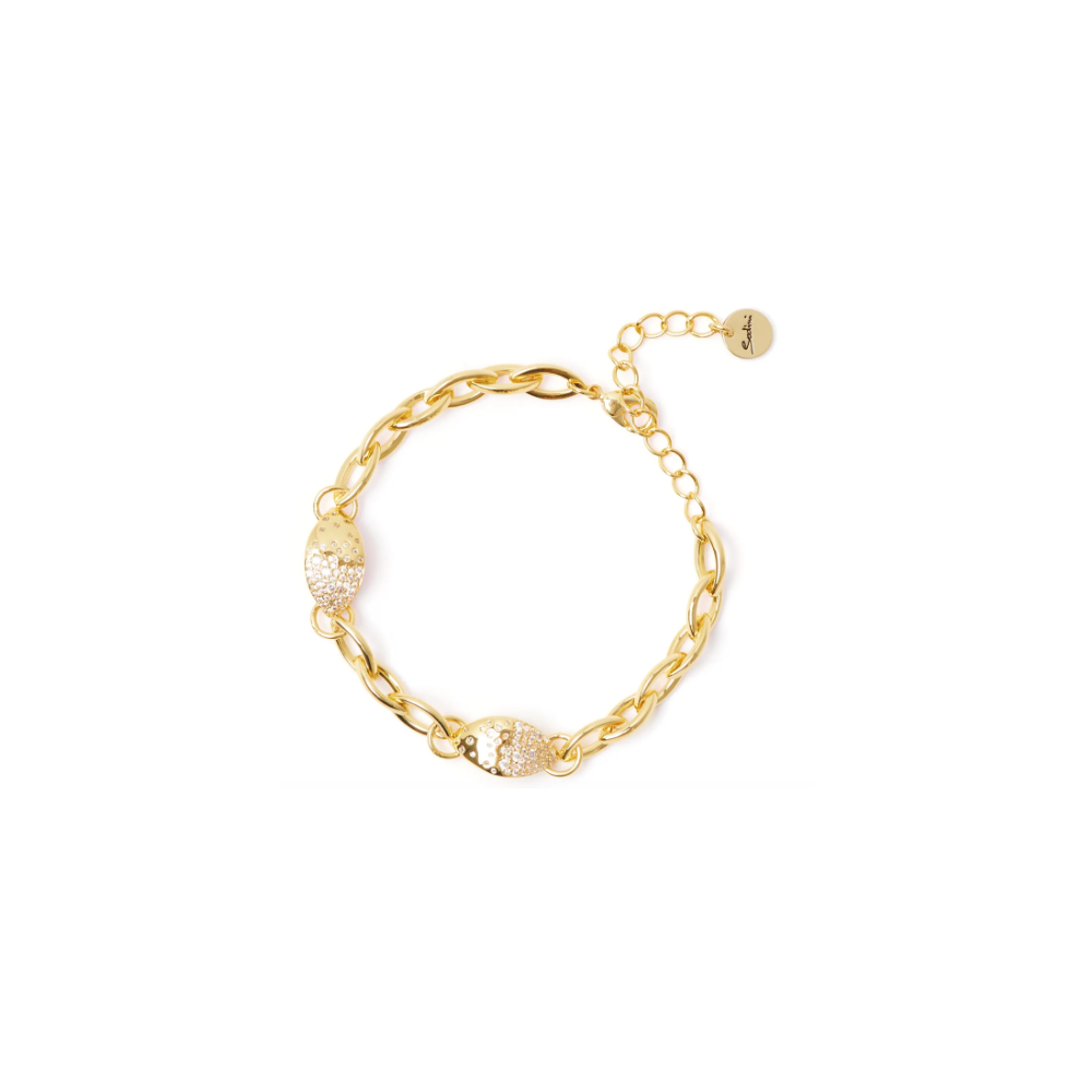 Scopri il fascino di indossare un braccciale dal design luminoso, con splendente catena che incorpora due abbaglianti elementi a forma di mandorla impreziositi da brillantissimi pavè di cristalli. Un accessorio super-chic con un accento trendy in una versione dalle cromie dell'oro, per essere sempre al centro dell'attenzione. Targhetta Sodini sull'estensione.