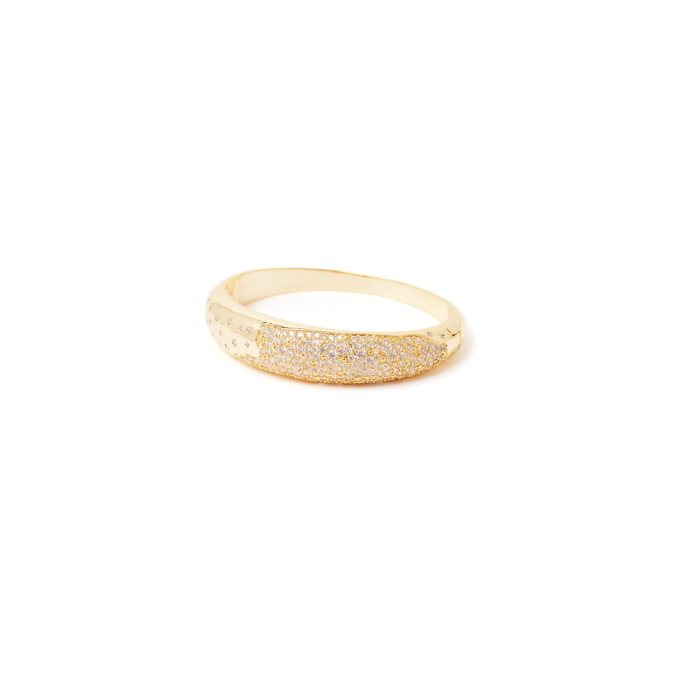 Scopri il fascino di indossare un bracciale rigido large dal design luminoso, con splendente fascia bombata e affusolata impreziosita da un originalissimo pattern con brillantissimo pavè di cristalli. Un accessorio di gran lusso con accento trendy in una versione dalle cromie dell'oro, per essere sempre al centro dell'attenzione, con logo Sodini.