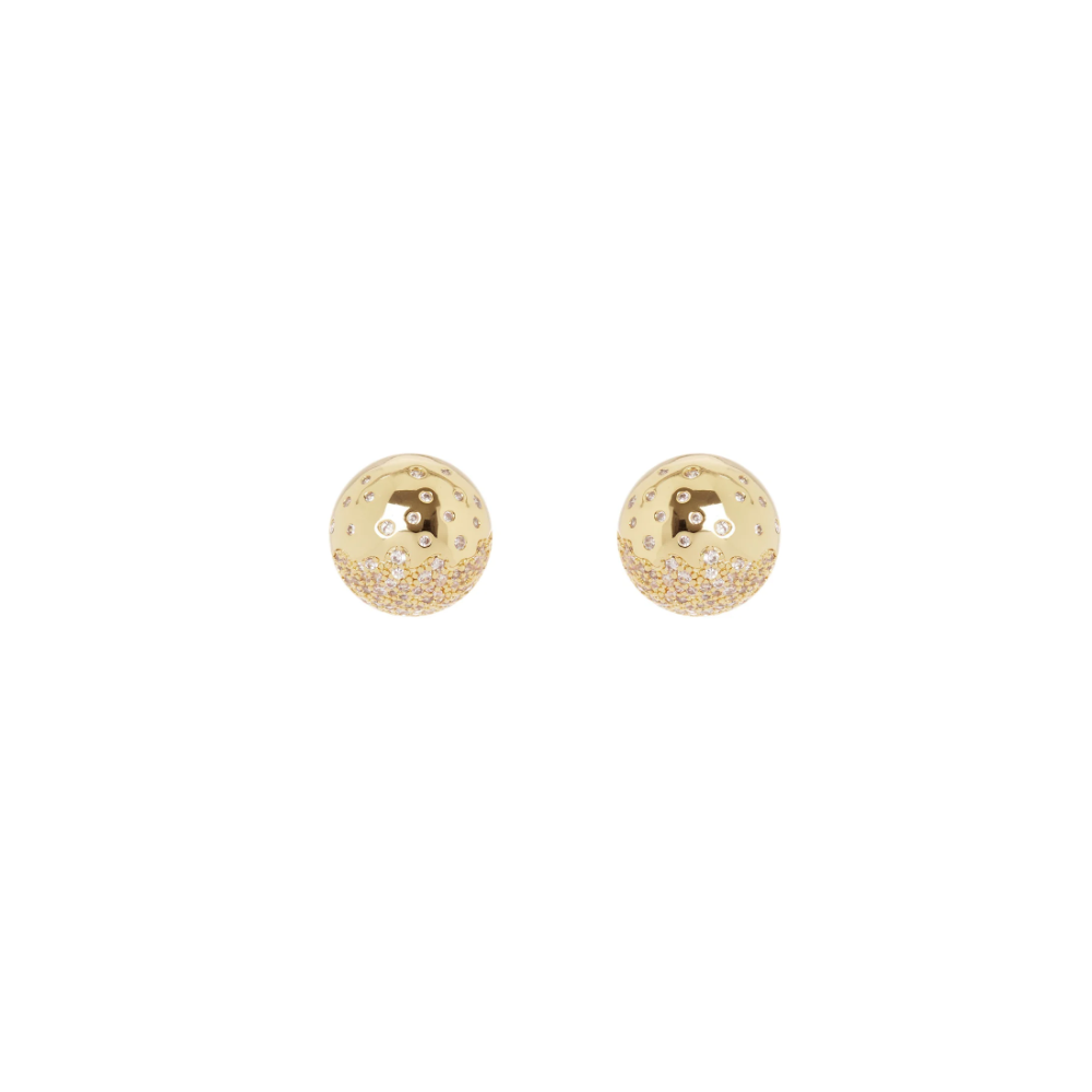 Un paio di orecchini di gran lusso dal design classico e contemporaneo allo stesso tempo, con splendente semisfera impreziosita da brillantissimo pavè di cristalli, per un unicum che porta splendore al viso. Accessori di pregio ideali per chi si sa distinguere, perfetti per serate speciali o quando preferisci, in una versione dalle cromie dell'oro. Logo Sodini sul retro.