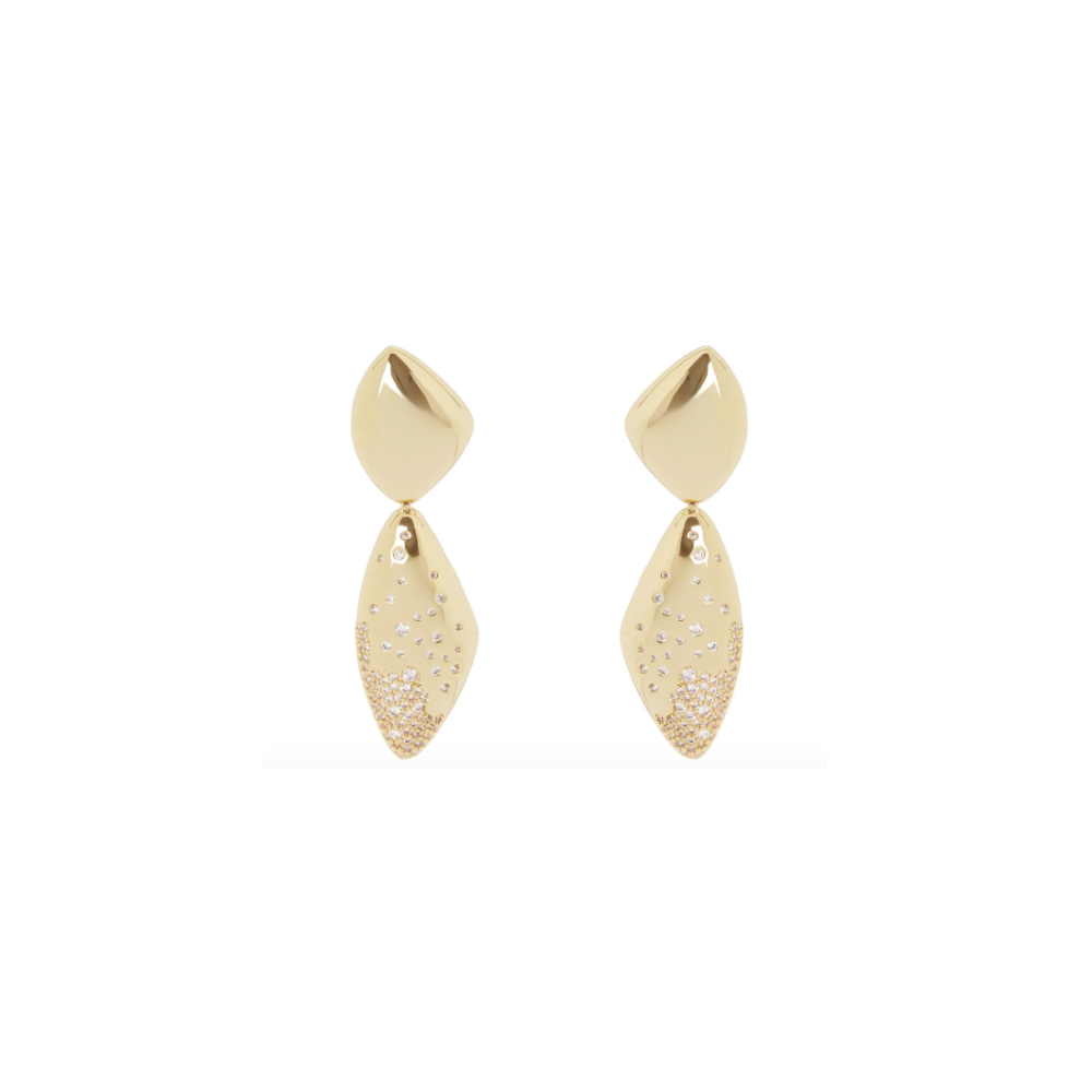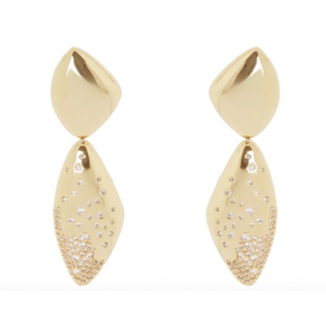 Sontuosi orecchini di concezione contemporanea, con due originali e splendenti elementi, uno al lobo che ne sorregge uno più grande impreziosito da brillantissimo pavè di cristalli. Accessori di pregio ideali per chi si sa distinguere, perfetti per serate speciali o quando preferisci, in una versione dalle cromie dell'oro. Logo Sodini sul retro.