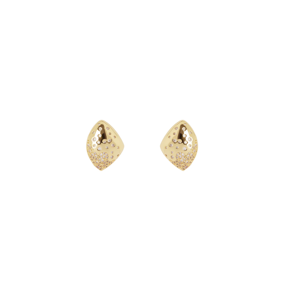 Un paio di sontuosi orecchini dal design intrigante, con splendente e originale elemento tridimensionale impreziosito da brillantissimo pavè di cristalli, per un unicum che porta splendore al viso. Accessori di pregio ideali per chi si sa distinguere, perfetti per serate speciali o quando preferisci, in una versione dalle cromie dell'oro. Logo Sodini sul retro.