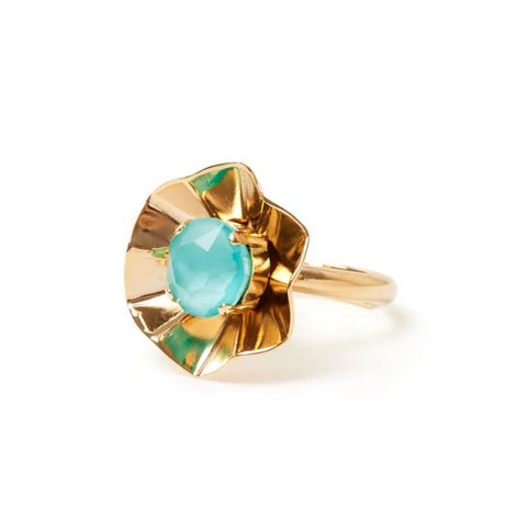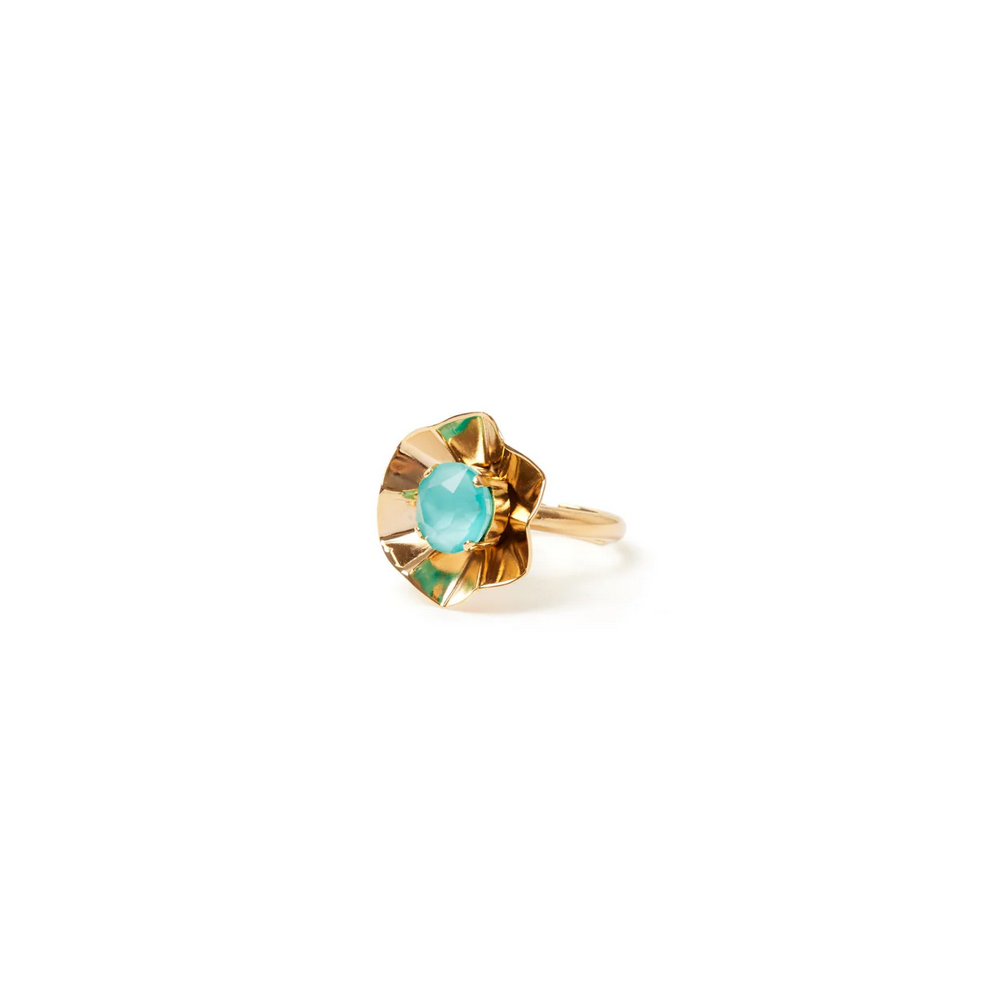 Questo sfizioso anello regolabile è l'ideale tocco finale per un look di grande charme. Design con splendente fascia e top a fiore con brillantissimo cristallo al centro e radiosi petali di lamina intorno, per regalare ipnotici effetti cromatici al tuo look. Un accessorio perfetto in qualsiasi occasione, in una versione dalle accattivanti cromie del turchese e oro. Logo Sodini sulla fascia.
