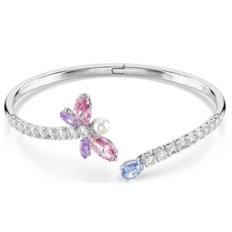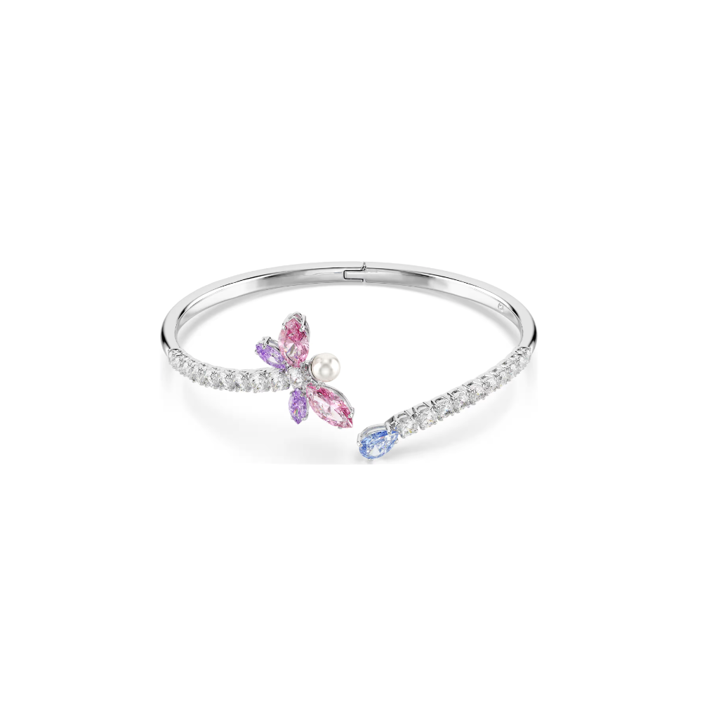 Il colore incontra la magia in un bangle ispirato alla natura. Impreziosito da un pavé di Swarovski Zirconia trasparenti, la fascia aperta presenta una Swarovski Zirconia blu taglio Pear a un’estremità e un motivo con la libellula all’altra, formato da ali rosa e viola e da una singola Crystal Pearl Swarovski. Il bangle colorato è realizzato con placcatura rodio e presenta una chiusura a cerniera e può essere indossato con altre creazioni coordinate della stessa famiglia con la libellula.