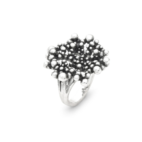 Dall'ispirazione delle bollicine di champagne, nasce questo delizioso anello in argento brunito. Pensato per decorare ed impreziosire ogni outfit, in uno scompiettante decoro di sferette luminose che si rincorrono. Realizzato in azienda, completamente a mano, con l'antica tecnica della fusione a cera persa.