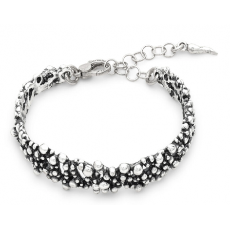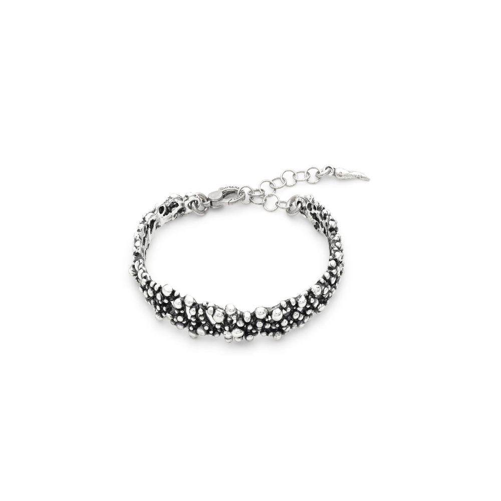 Piccole sferette sono protagoniste uniche di questo bracciale. Realizzato tramite la tecnica della fusione a cera persa con bruniture d'eccellenza, questo gioiello richiama piccole bollicine di champagne, creando giochi di luce. Realizzato a mano in azienda.