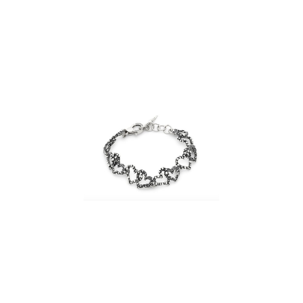 Delicati cuori si susseguono creando un bracciale di raffinata armonia. Ogni elemento, realizzato in argento brunito, è plasmato come una piccola opera d’arte, curata in ogni minimo particolare. La sapiente manifattura artigianale valorizza le texture e i rilievi, esaltando il dialogo tra chiaroscuri e profondità. Interamente realizzato a mano in azienda.