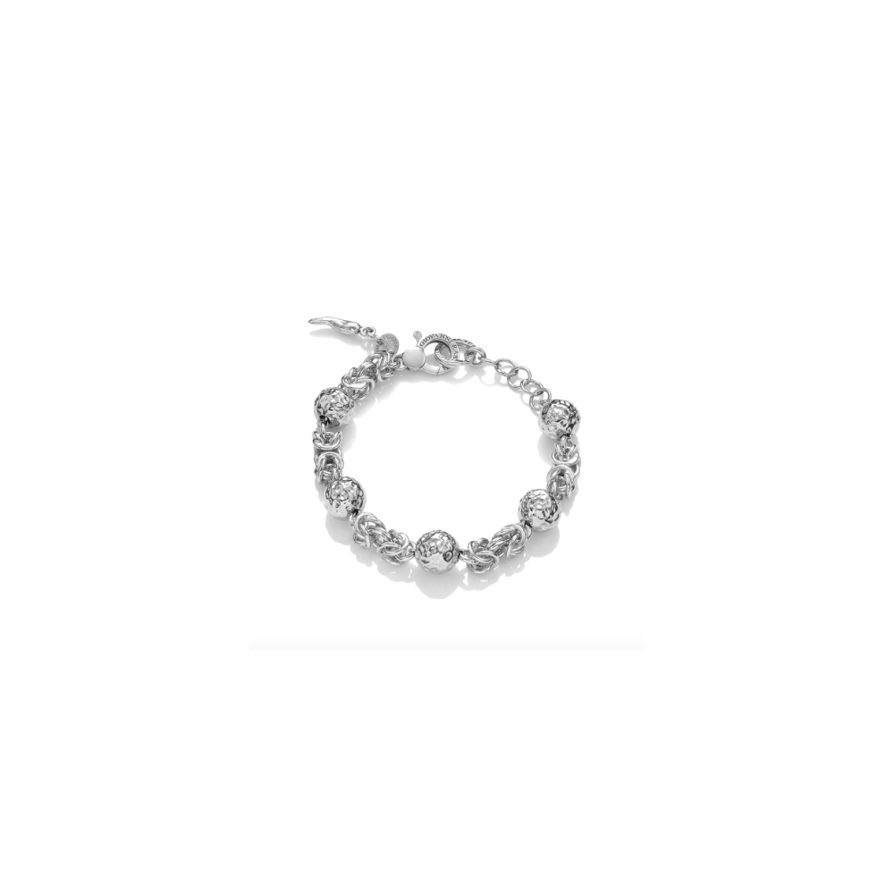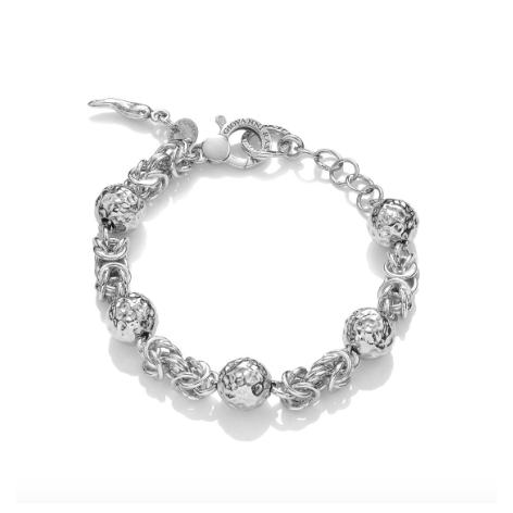 Questo bracciale in argento, luminosissimo, viene realizzato alternando sfere in argento, martellate a mano, a elementi di catena con maglie estremamente eleganti. Un gioiello iconico e dal fascino unico.