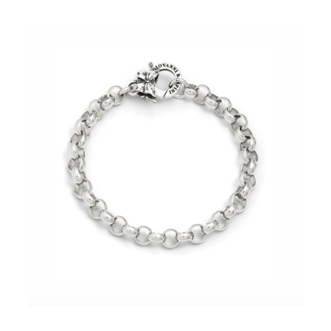 Un elegante bracciale base per i charms di Giovanni Raspini in catena rolò, pensato per accogliere i tuoi ciondoli preferiti. Realizzato a mano in argento e impreziosito da una delicata chiusura decorata con un quadrifoglio, fuso a cera persa. Interamente fatto a mano in azienda.