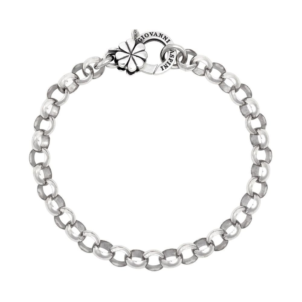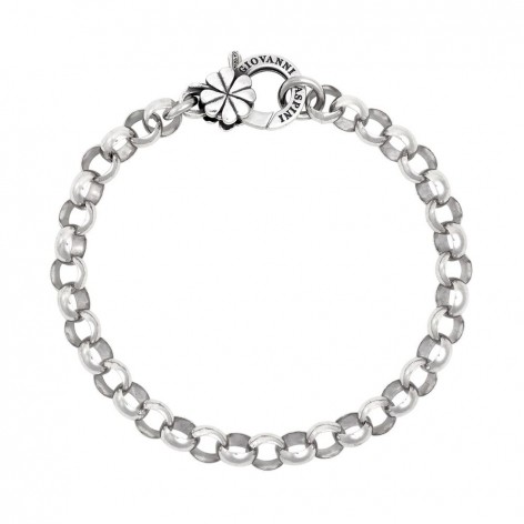 Un elegante bracciale base per i charms di Giovanni Raspini in catena rolò, pensato per accogliere i tuoi ciondoli preferiti. Realizzato a mano in argento e impreziosito da una delicata chiusura decorata con un quadrifoglio, fuso a cera persa. Interamente fatto a mano in azienda.