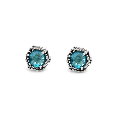 Gli orecchini Blue Ivy esprimono un’eleganza senza tempo attraverso un cristallo rotondo sfaccettato celeste. Il decoro, realizzato con la raffinata tecnica della fusione a cera persa, si anima di un delicato motivo floreale. Realizzato a mano in azienda.