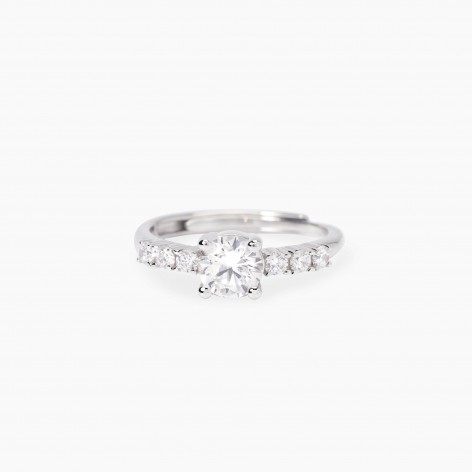 Anello regolabile in argento rodiato con zirconi bianchi.