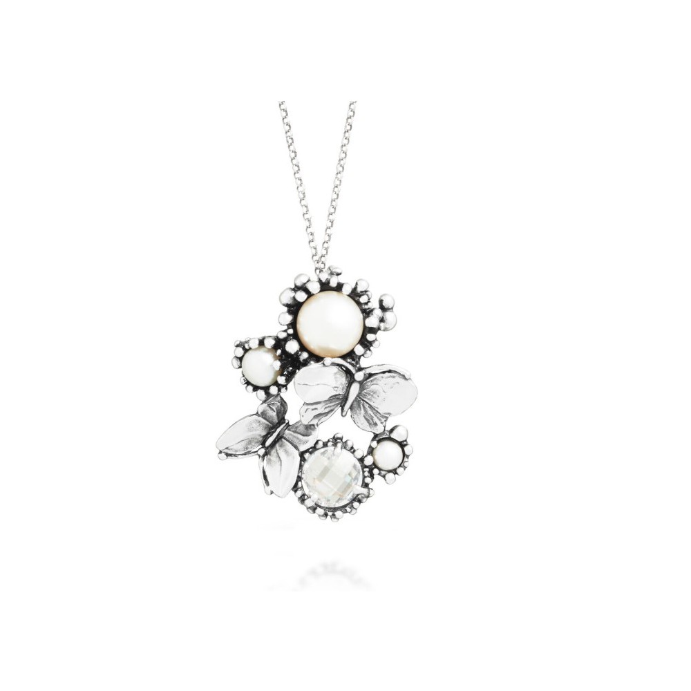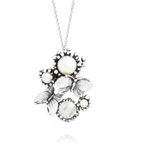 In questo elegante pendente in argento fuso e quindi brunito, un decoro primaverile, caratterizzato da due farfalle finemente modellate a mano con altri elementi naturalistici, fa da elegante castone a quattro gemme: tre perle naturali d'acqua dolce di diverse dimensioni ed un bellissimo e delicato zircone tondo sfaccettato. Completa il pendente una catena micro rolò diamantata da 80 cm. Interamente fatto a mano in azienda.