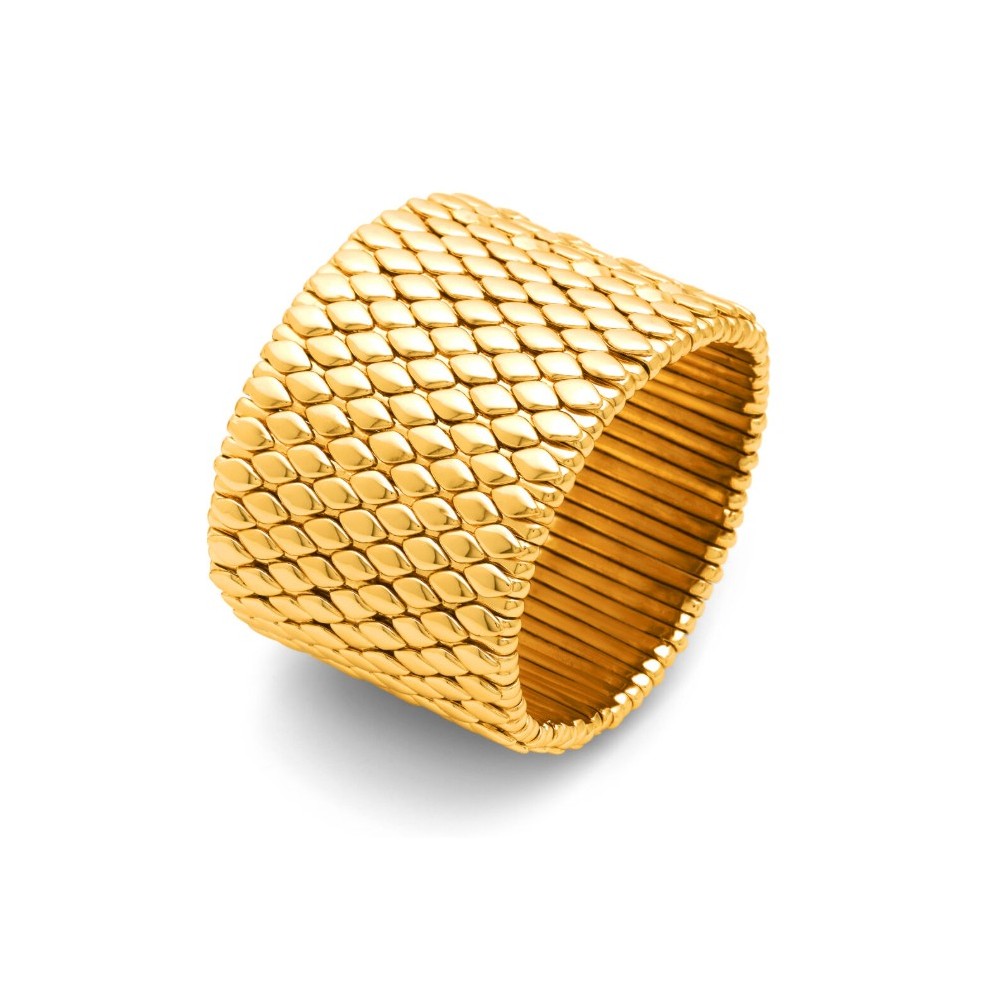 Un bracciale di grande impatto, dalla texture dinamica e contemporanea, capace di catturare la luce e suggerire un dinamismo visivo unico. La presenza di molle interne nascoste garantisce una vestibilità confortevole. Un gioiello fatto a mano, espressione dell’arte orafa e della maestria artigianale di Giovanni Raspini.