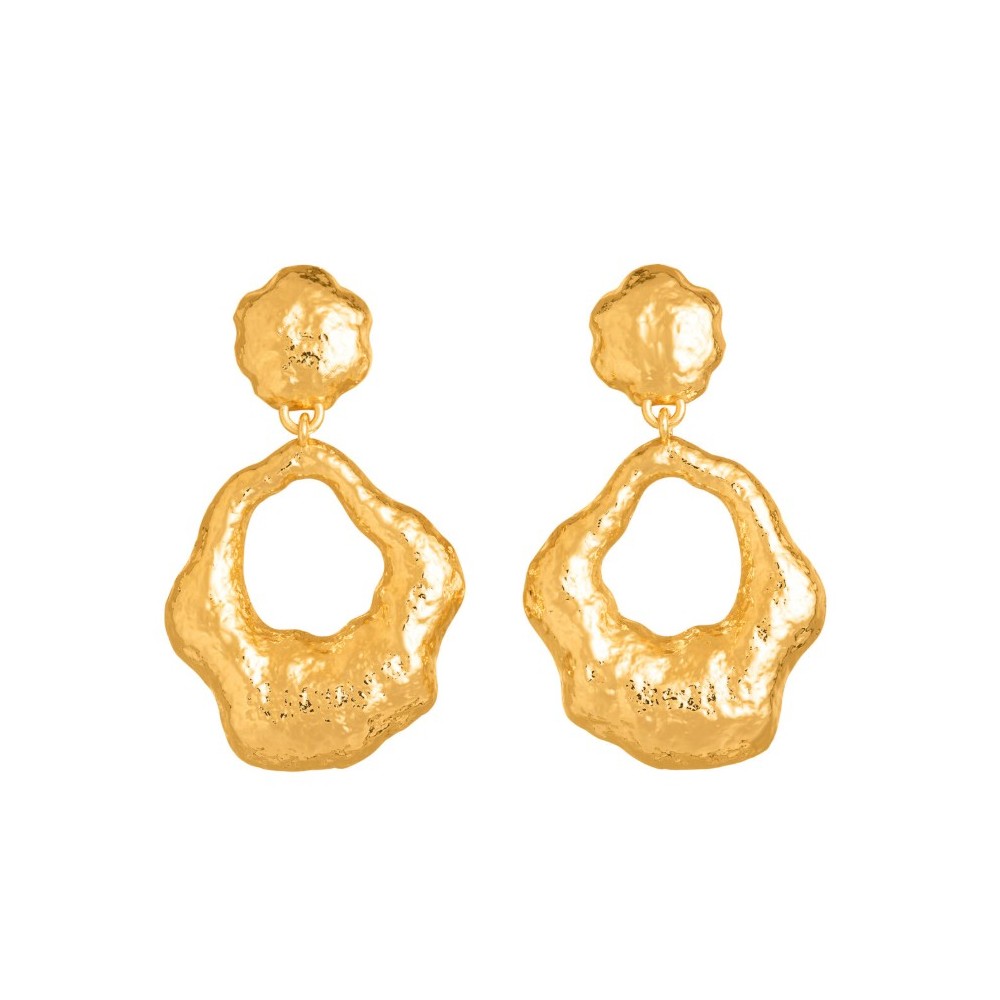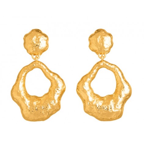 Luminosi e materici, questi orecchini pendenti sono realizzati con due elementi di forma organica in bronzo bagnato in oro e martellato a mano. Tutto il fascino antico della fusione a cera persa. Fatti in azienda.