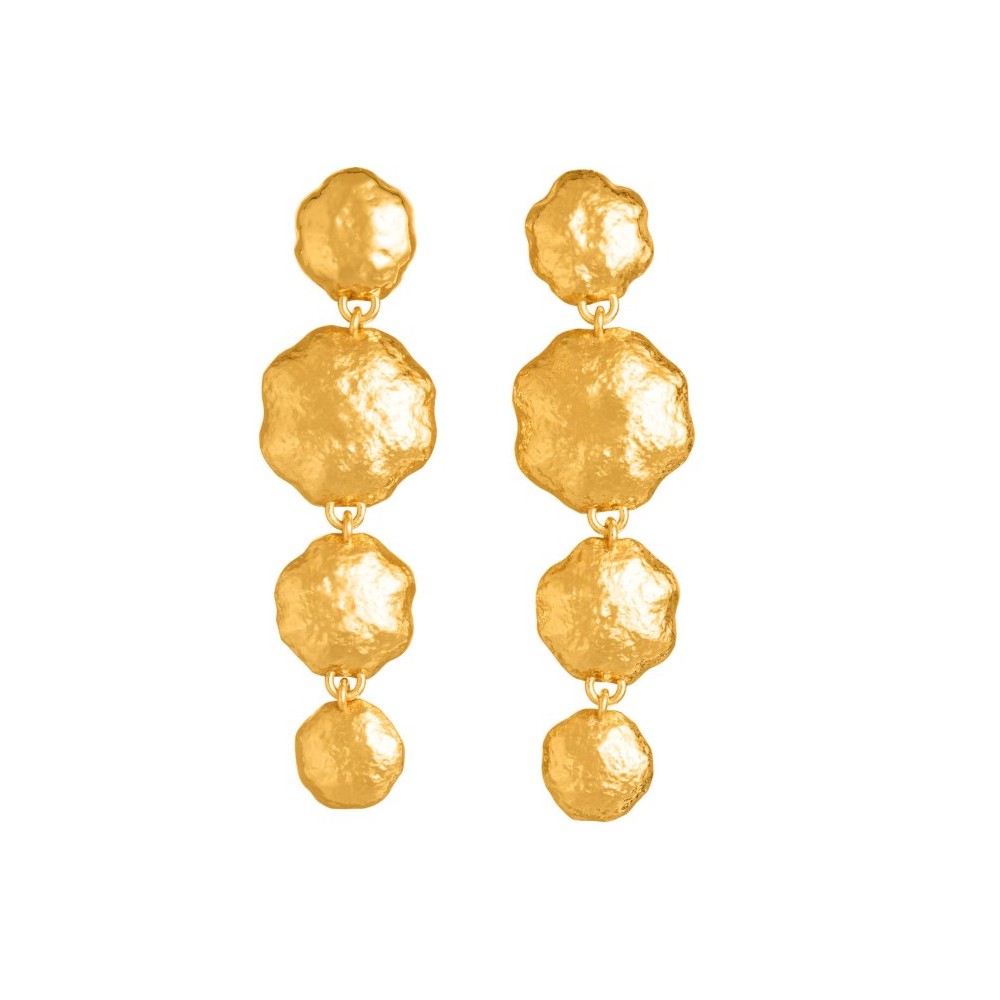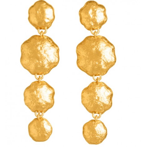 Materici ed eleganti, questi orecchini pendenti sono realizzati in bronzo dorato, martellati a mano e caratterizzati da elementi di diverse dimensioni. Racchiudono tutto il fascino antico della fusione a cera persa e l’artigianalità tipica dell’azienda Giovanni Raspini.
