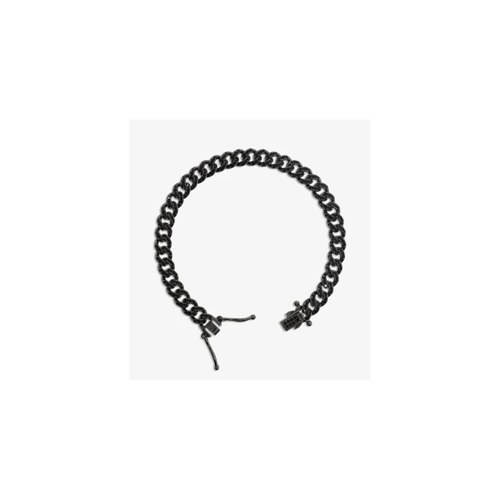 Bracciale in Argento 925, placcato Rutenio, con catena grumetta impreziosita da pavé di spinelli neri. Chiusura a cassetto con 8 di sicurezza.