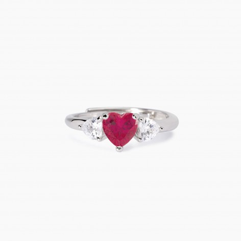 Anello regolabile da donna in argento rodiato con zirconi e rubino sintetico taglio cuore.