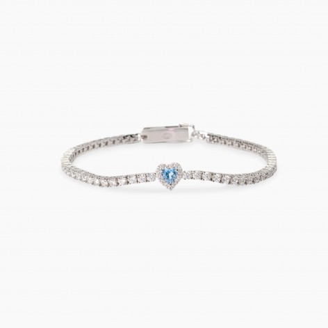 Bracciale tennis in argento rodiato con zirconi bianchi e acquamarina sintetica taglio cuore.