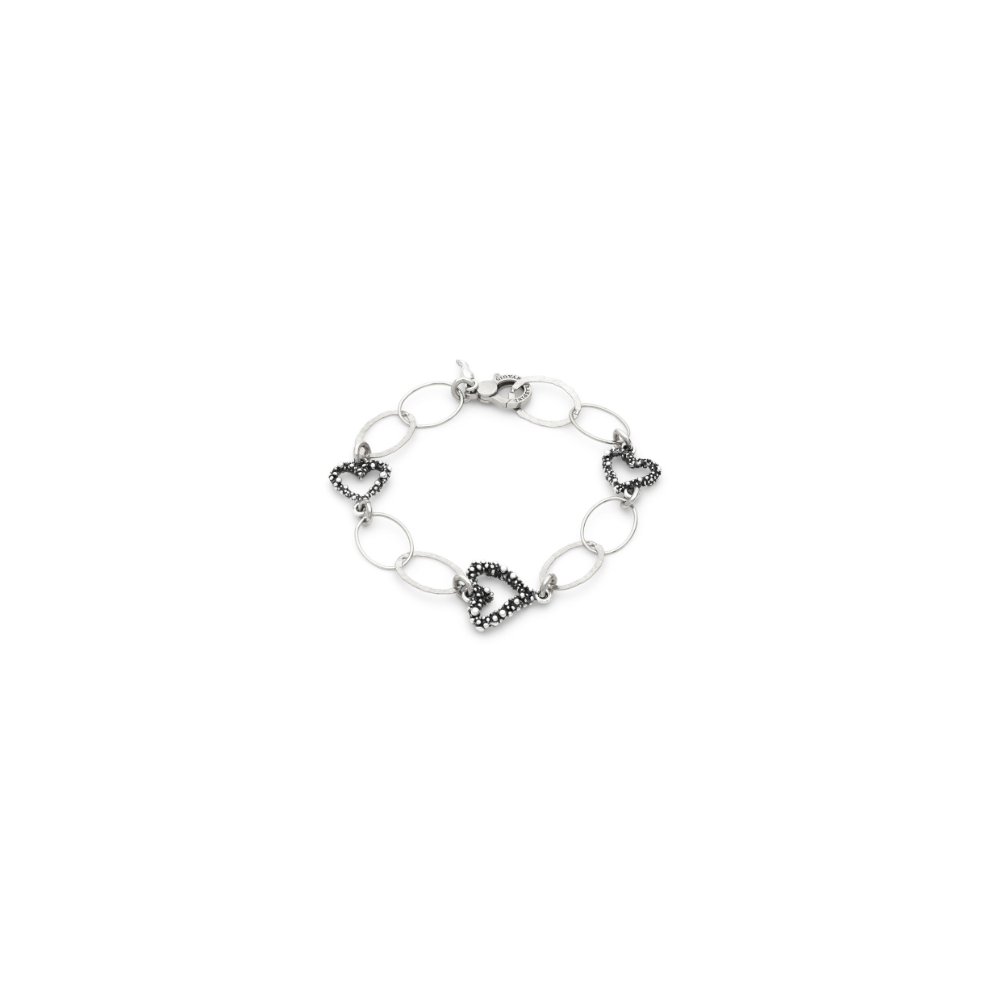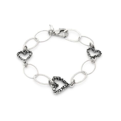 Un susseguirsi di cuori e catene dalle maglie ovali, lisce e martellate, dà vita a un gioco di luce e armonia, in un delicato intreccio che evoca un dialogo continuo tra forme e sentimenti. Questo bracciale avvolge con leggerezza il polso donando un tocco luminoso e ricercato. Le maglie alternate creano un ritmo dinamico che valorizza la finitura brunita, mentre i cuori si inseriscono come piccoli simboli preziosi, custodi di emozioni e significati profondi. Il risultato è un gioiello perfetto da indossare ogni giorno o da regalare come segno autentico di affetto. Fatto a mano in azienda.