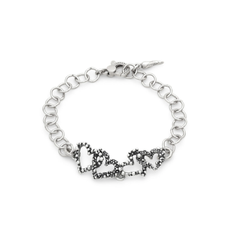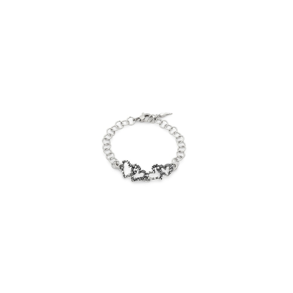 Un prezioso intreccio di cuori in argento brunito è il protagonista di questo elegante bracciale. Simbolo di un amore forte e senza tempo, il cuore diventa il filo conduttore di un gioiello dal carattere deciso e profondamente romantico. Un accessorio capace di raccontare sentimenti autentici e legami duraturi. Fatto a mano in azienda.