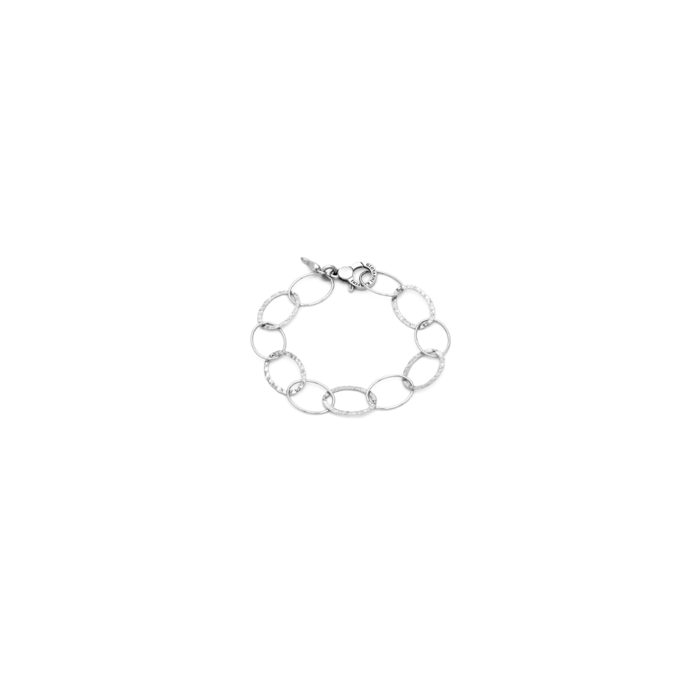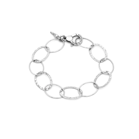Un bracciale in argento che alterna due tipi di maglie ovali artigianali, leggere e luminosissime. Le maglie, diverse ma perfettamente armonizzate tra loro, creano un raffinato gioco di movimento e riflessi, valorizzando la lavorazione manuale e l’attenzione ai dettagli. Il design armonioso avvolge il polso con naturalezza, rendendolo ideale sia per l’uso quotidiano sia per completare look più ricercati. Un gioiello contemporaneo di grande personalità. Fatto a mano in azienda.