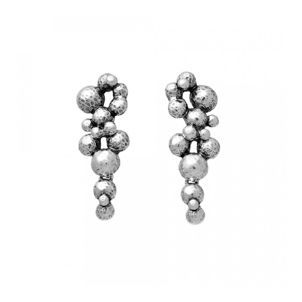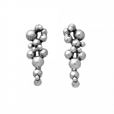 Gli orecchini Cascata Bubbles sono caratterizzati da sferette in argento brunito ad effetto martellato che si rincorrono, riflettendo la luce in modo particolarissimo. Un gioiello iconico che racconta tutto il fascino antico e contemporaneo della fusione a cera persa. Realizzato in azienda completamente a mano.