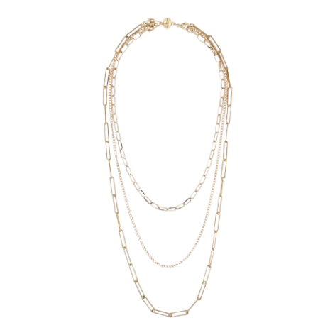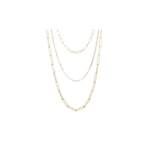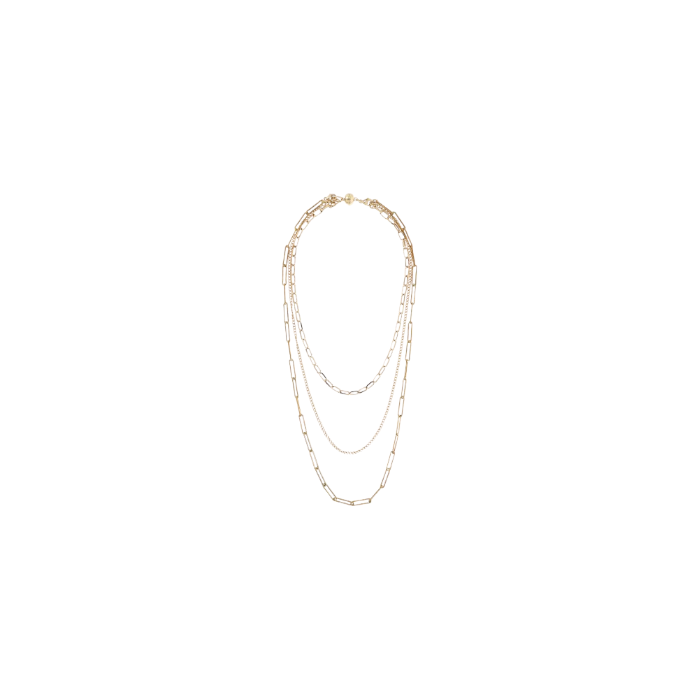Collana Bronzallure realizzata in lega Golden Rosé, placcata oro giallo 18kt, composta da tre fili graduati: collana più corta maglia forzatina (40.5 cm); collana intermedia maglia grumetta (51 cm); collana più lunga maglie ovali allungate (61 cm). Chiusura magnetica complessiva. Ogni collana ha la propria chiusura che permette di indossarle singolarmente.