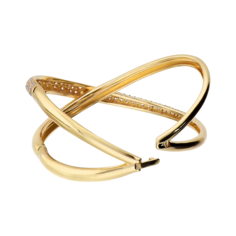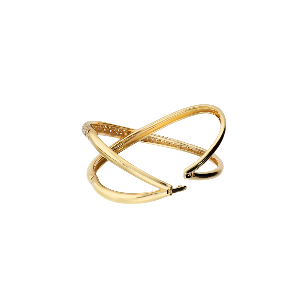 Bracciale rigido Bronzallure realizzato in lega Golden Rosé, placcata Oro 18kt, dal design a incrocio con superficie lucida e in pavé di cubic zirconia, qualità luminosa.