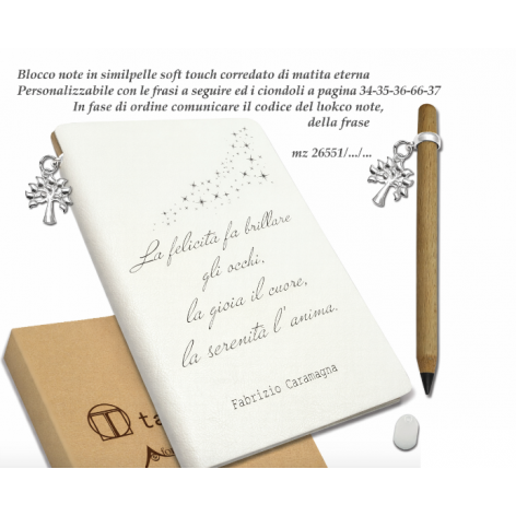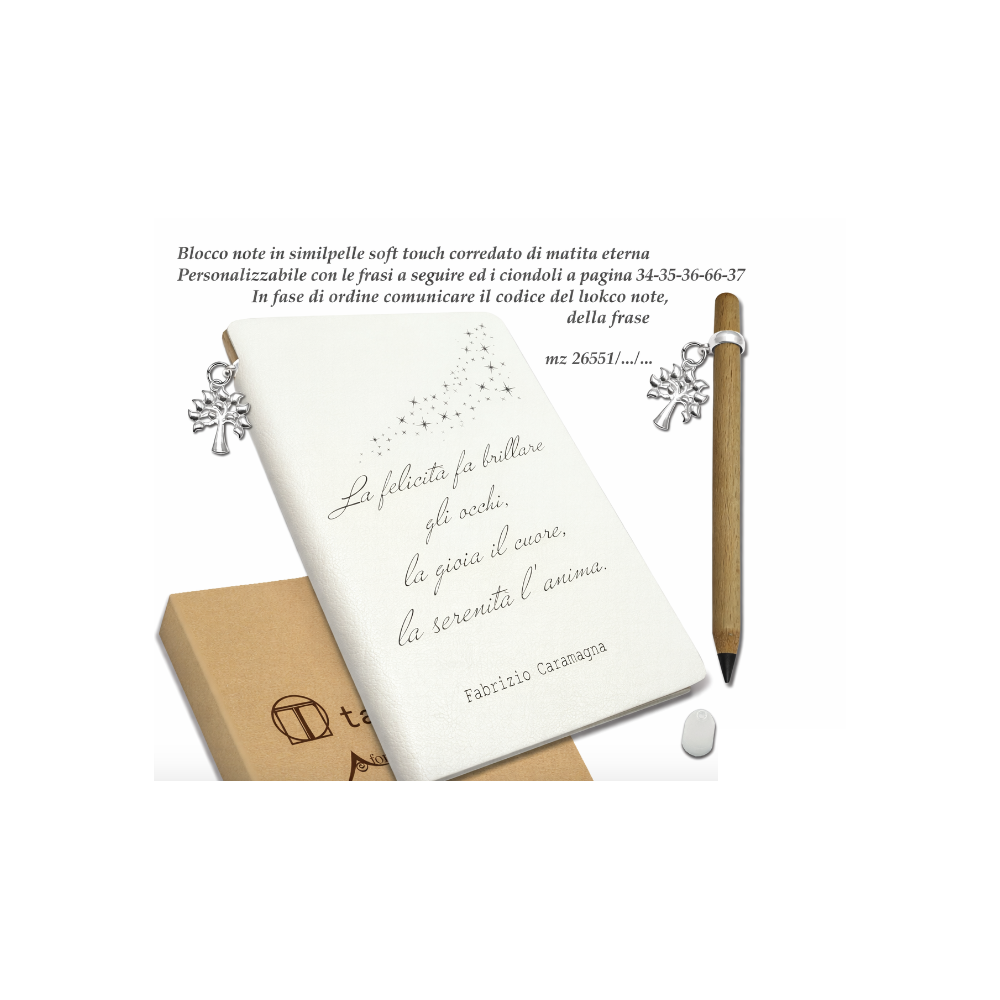 Il blocco è corredato di matita eterna coordinata e ciondolo decorativo in metallo, entrambi inclusi nel prezzo.