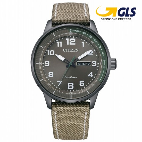 Cassa in acciaio con finitura GIP, brunito. Fondo serrato a vite. Cinturino in tessuto tecnico. WR 10 bar.