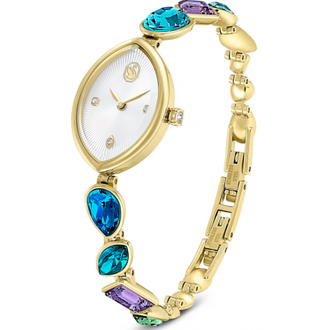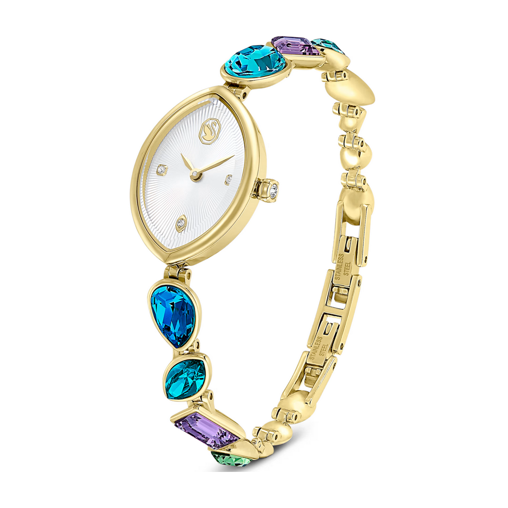 Con la sua attraente collisione di forme, l’orologio Swarovski è ispirato alla famiglia di gioielli Gema. La cassa a forma di mandorla è realizzata in acciaio inossidabile con finitura in tonalità oro e presenta un quadrante guilloché con tre indici in cristallo e un elegante emblema a forma di cigno. Al polso, l'orologio si distingue con il suo set di bracciali regolabili con otto cristalli diversi in una varietà di tagli e colori. Resistente all’acqua fino a 50 m, è un modo giocoso per aggiungere un pizzico di radiosa geometria al tuo stile.